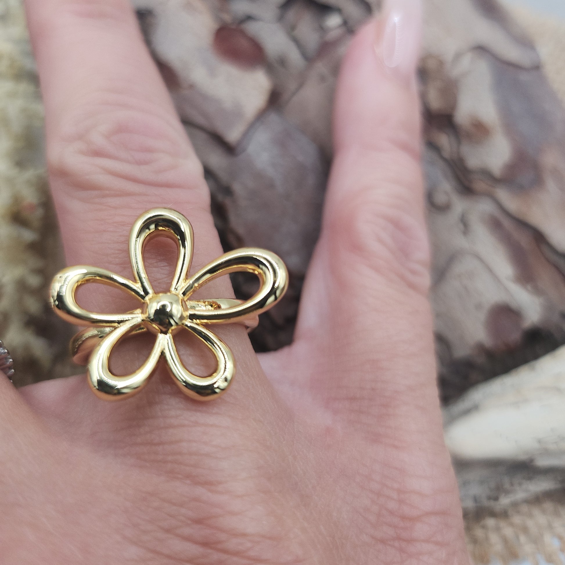 Adjustable ring gold daisy flower pretty gift ontrendMake a statement with the Azra Gold Daisy Adjustable Ring! Its trendy and non-tarnish gold-plated metal daisy blossoms will turn heads and make any outfit pop. With its adjustable shape, this ring makes a perfect gift for the special people in your life. Embrace your inner flower child with this must-have piece!